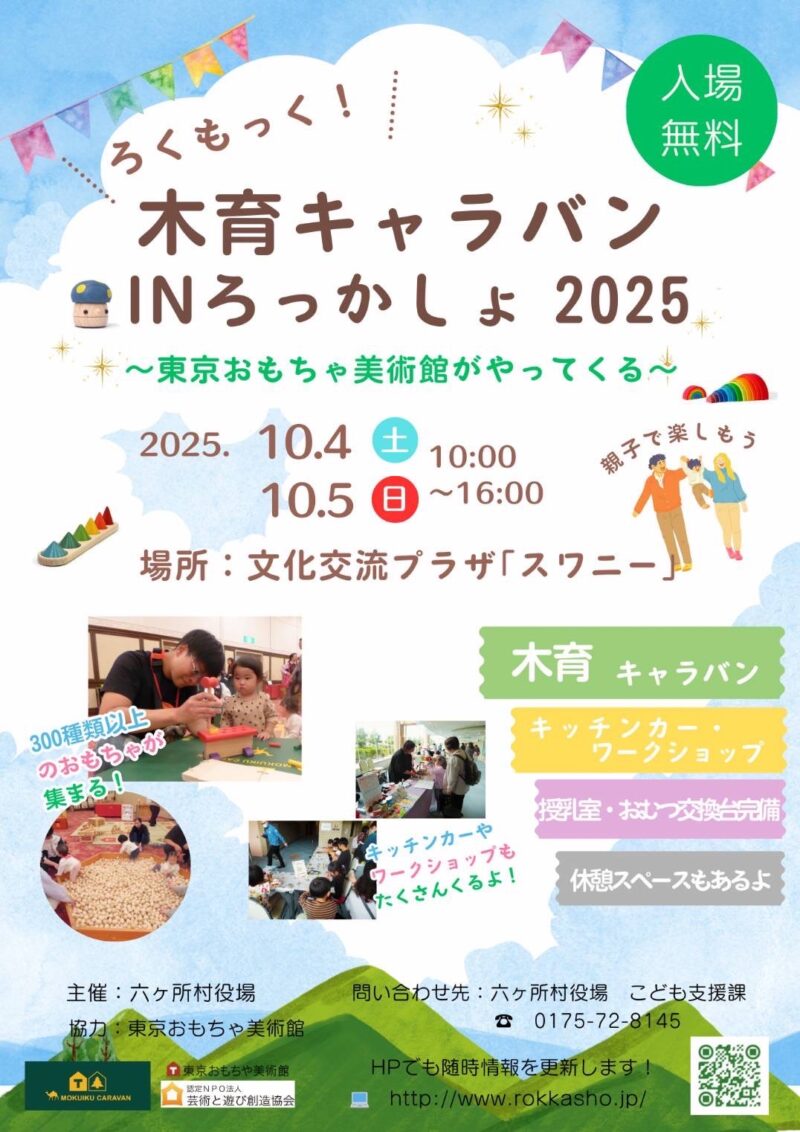 2025年10月4日(土)・5日(日)、青森県六ヶ所村の文化交流プラザ「スワニー」で、東京おもちゃ美術館がやってくる特別イベント「木育キャラバン」が開催されます!