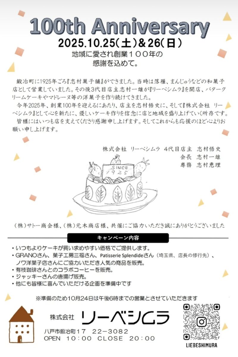 八戸のお菓子屋さん「リーベシムラ」が、なんと今年で100周年という節目を迎えます!
