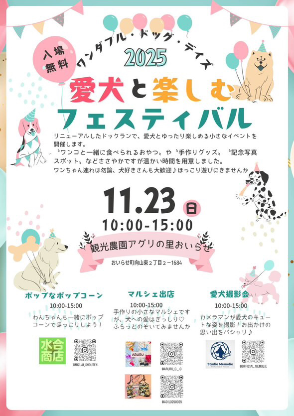 青森県おいらせ町の観光農園「アグリの里おいらせ」で、家族も愛犬も一緒に楽しめる感謝祭が開催されます! 体験あり、グルメあり、癒しありのイベントですよ~✨